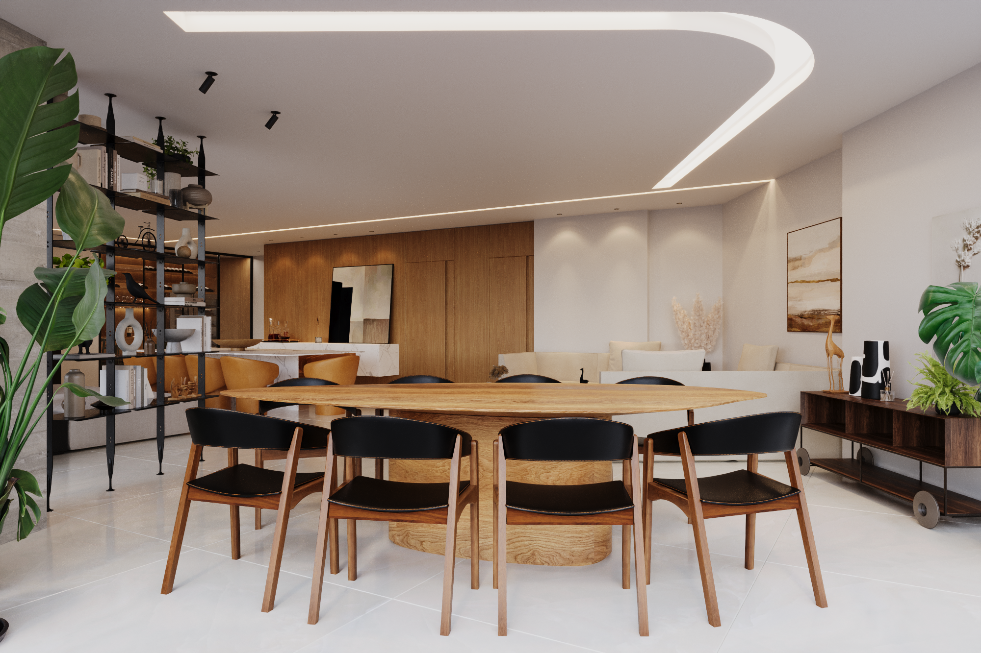 O conceito central parte da ideia de habitar com fluidez, permitindo que sala, jantar, estar e cozinha se comuniquem visualmente, sem perder a individualidade de cada ambiente. A marcenaria em madeira natural dialoga com o mármore claro e a iluminação linear embutida, que percorre o forro como um gesto contínuo, reforçando a amplitude e a harmonia.