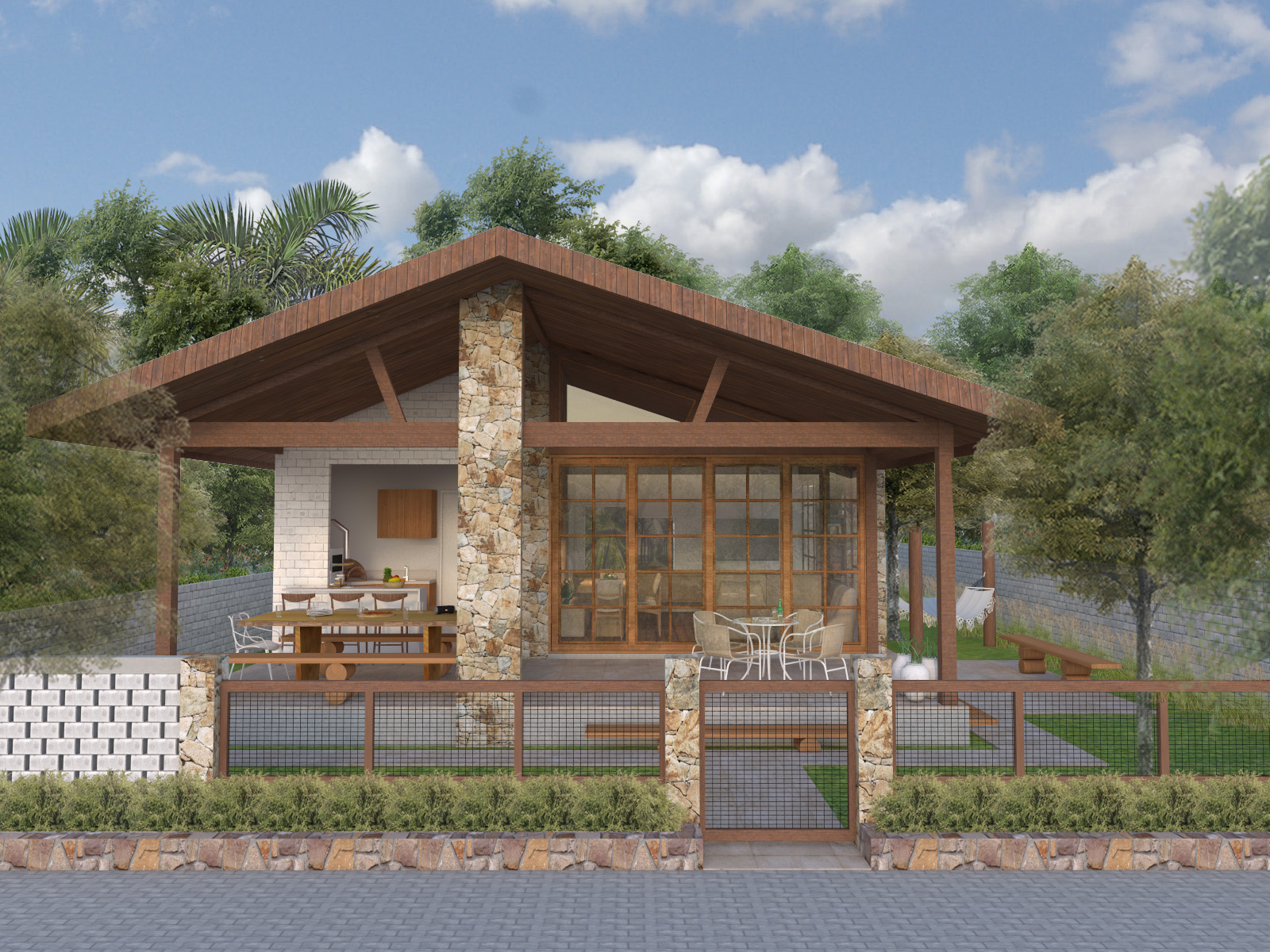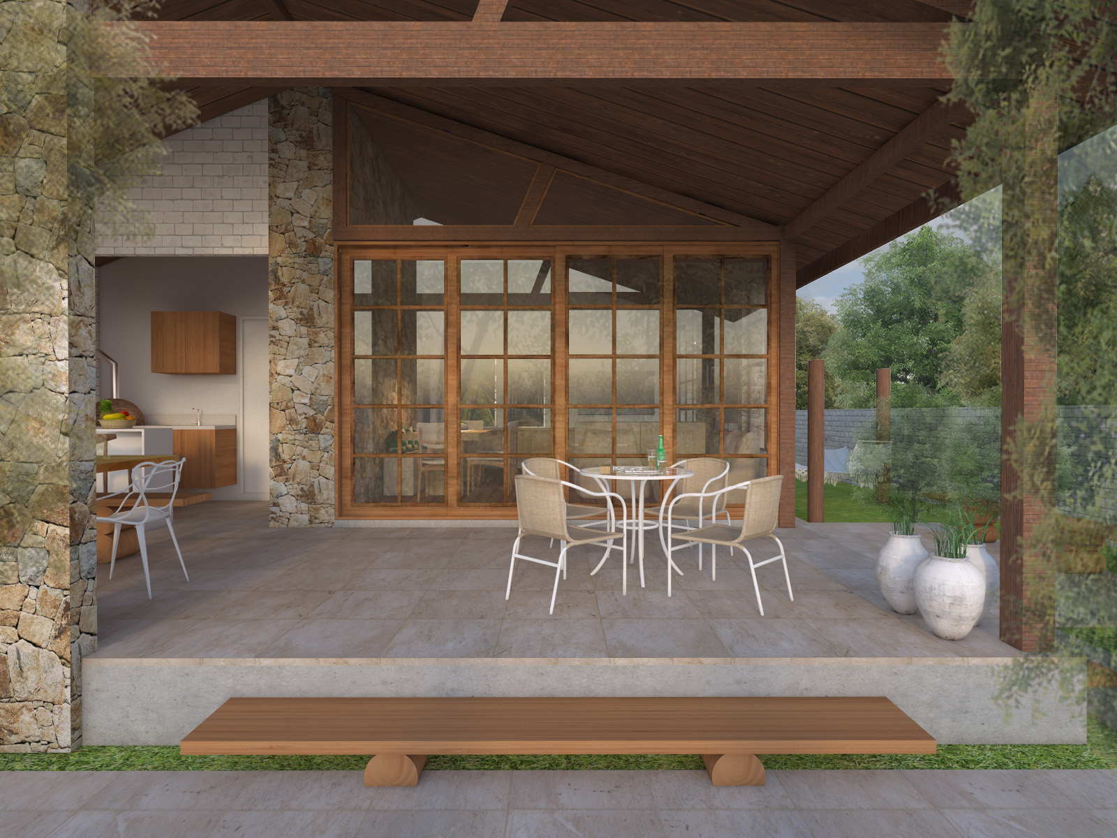 O projeto valoriza a estrutura original e incorpora novas soluções arquitetônicas e paisagísticas, com destaque para o uso de pedra natural, madeira aparente e alvenaria exposta, criando uma linguagem rústica refinada, coerente com o contexto local.